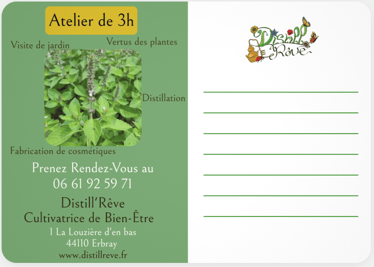 - Atelier Découverte de la distillation : atelier en extérieur, autour de l’alambic, vous apprenez et participez à distiller une plante, tout en découvrant ses vertus. 50€ – 3h