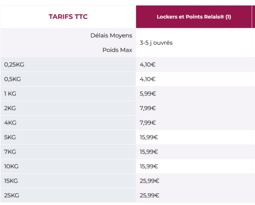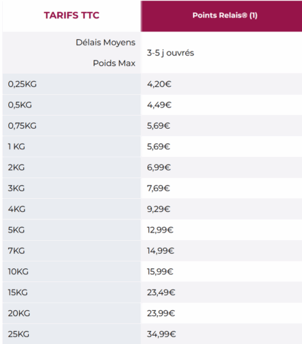 Les frais de port sont proportionnels au poids du colis en fonction des tarifs proposés par Mondial Relay.